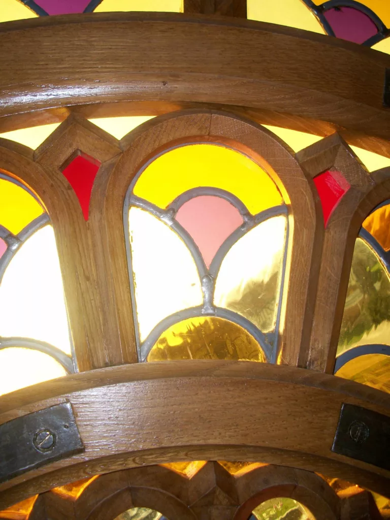 Réintégration des vitraux, en coordination avec un maître verrier, après nettoyage, remaillage et repose dans la menuiserie restaurée ;