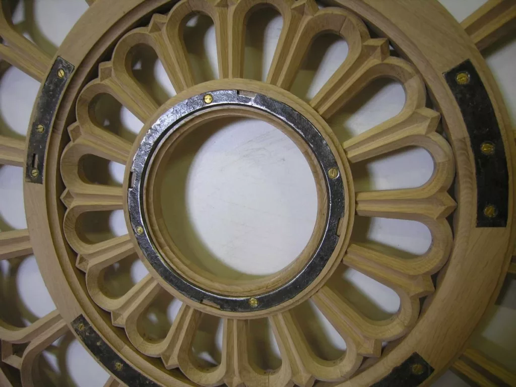 Restauration de la menuiserie rayonnante en chêne, avec remplacement des éléments altérés et consolidation des assemblages ;