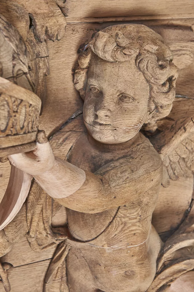 Reprise et restitution des éléments sculptés dégradés sur les boiseries, corniches ou décors associés à la façade. Ce travail a été mené par des sculpteurs sur bois spécialisés, dans le respect des techniques artisanales traditionnelles.